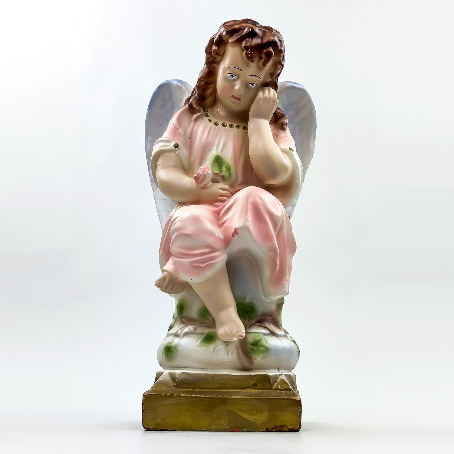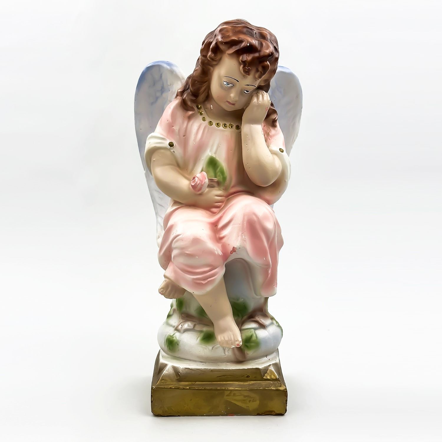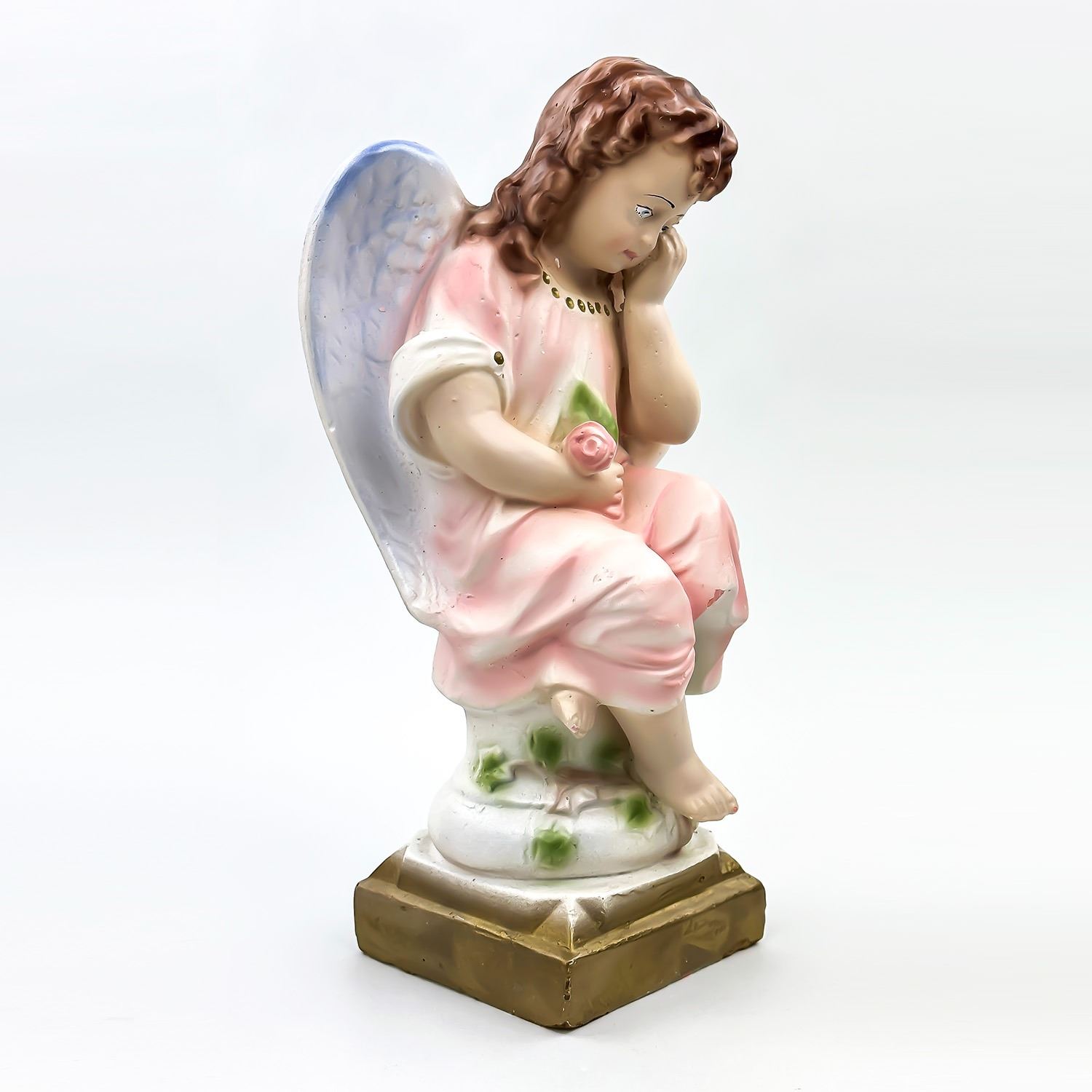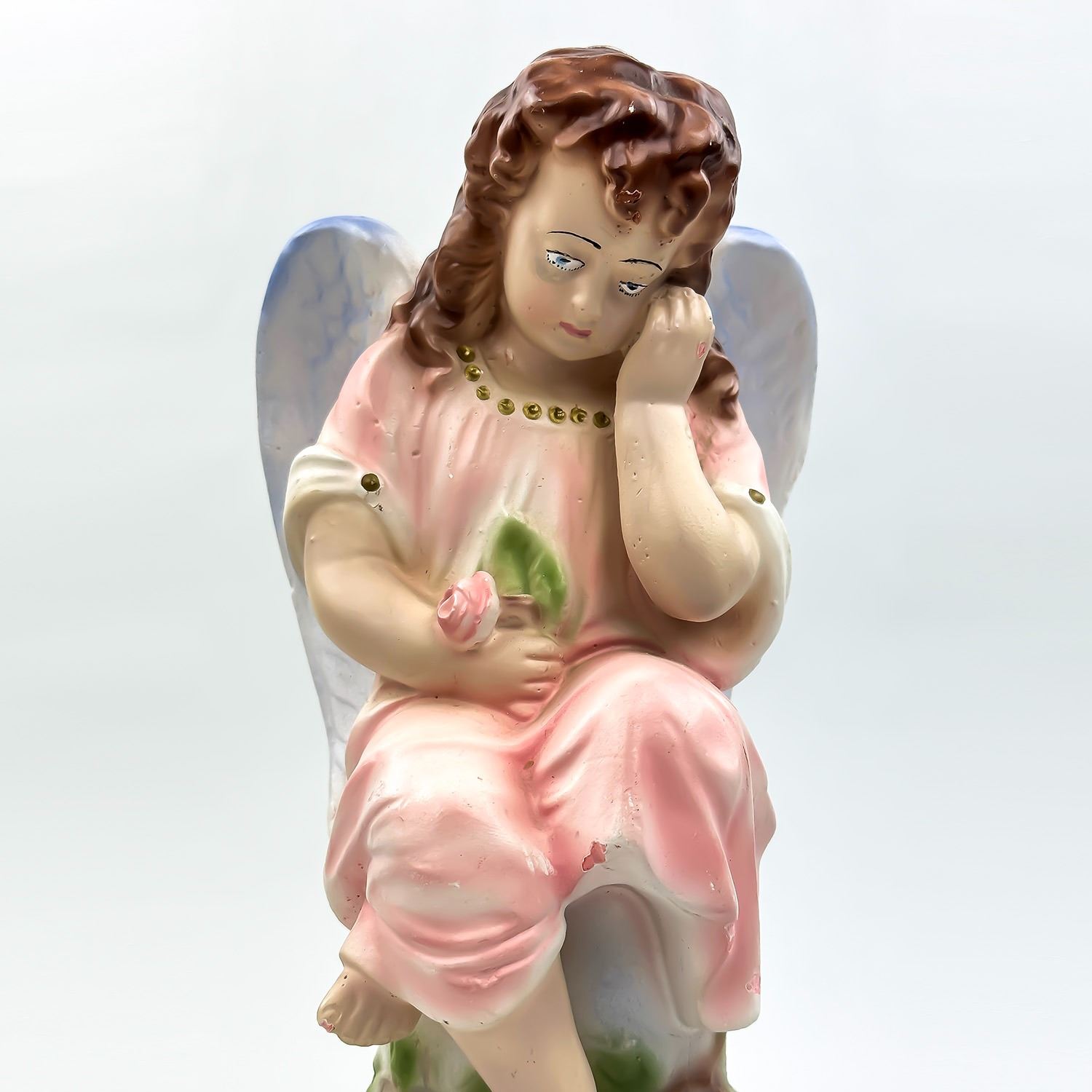 #8014 - HAND CRAFTED AND PAINTED ANGEL FIGURE FIGURINE. EXACT AGE AND ORIGIN UNKNOWN. SAD ANGEL GIRL WITH WINGS HOLDING A ROSE. SOME MINOR SURFACE IMPERFECTIONS, BUT NOT AT ALL BAD. MEASURES: 11” (28 CM) TALL BY 5.25” (13.5 CM) WIDE AT HER WINGSAND***ITEM(S) LOCATED IN LETHBRIDGE ALBERTA. FREE TRANSPORT TO EDMONTON OFFICE AVAILABLE FOR THIS AUCTION. WORLDWIDE SHIPPING IS AVAILABLE FOR ALL ITEMS