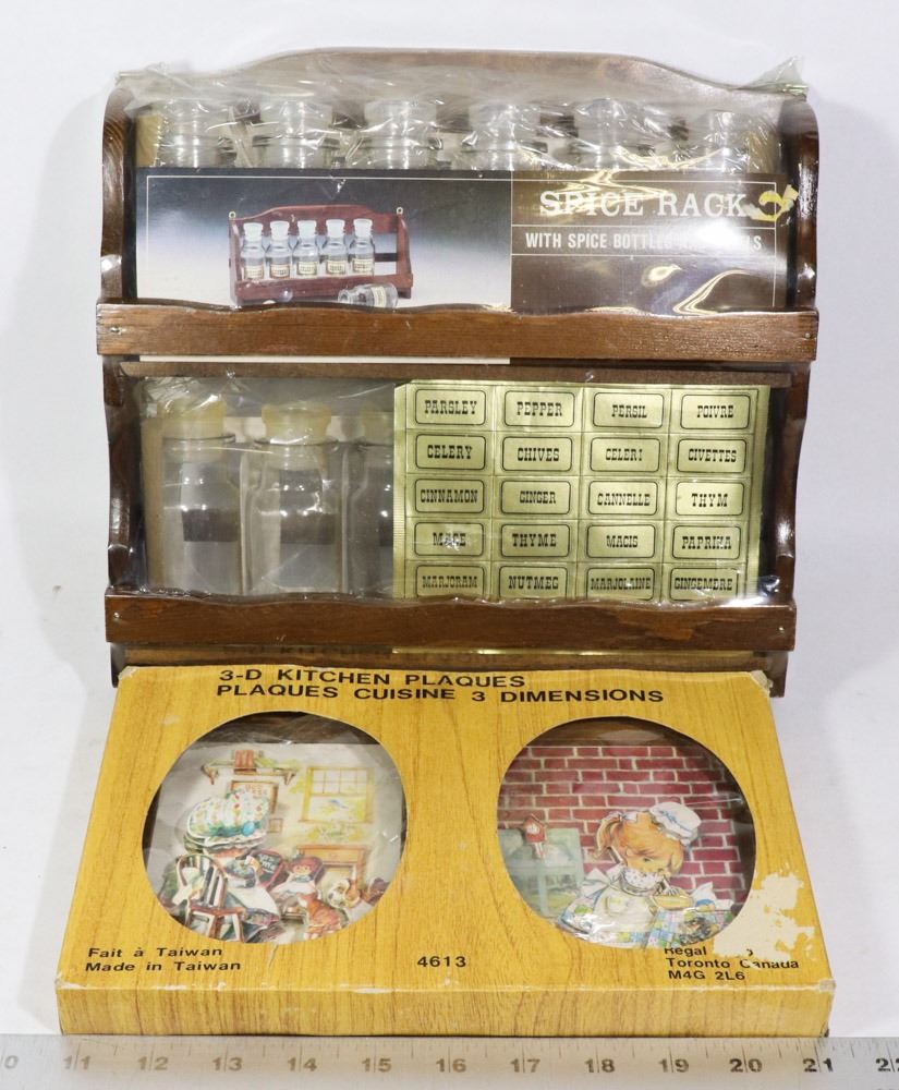 RACK W/REGAL (2) 3D KITCHEN PLAQUES (UNUSED). COLLECTIBLES