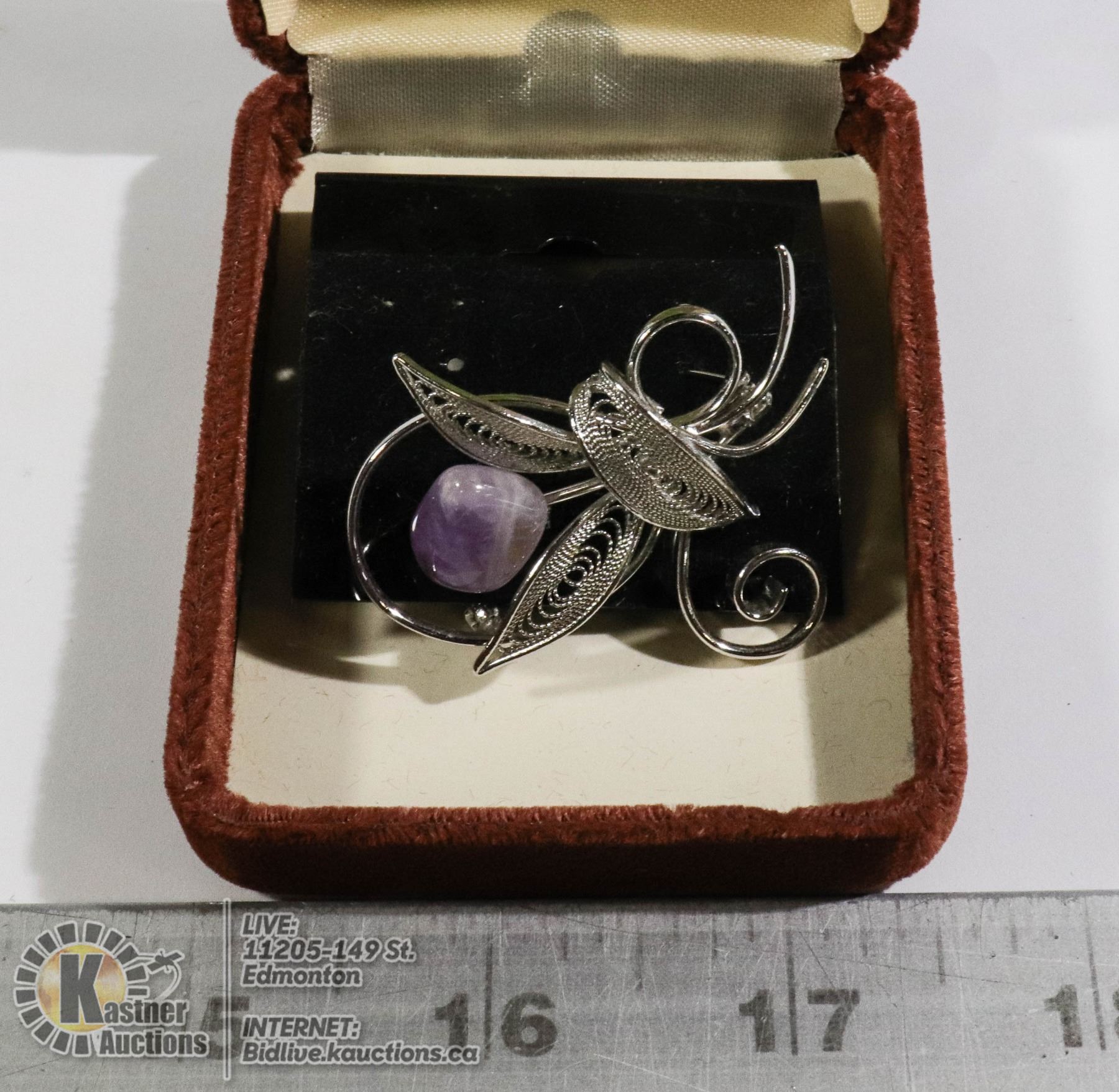 VINTAGE SILVER FILLIGREE & AMETHYST BROOCH
