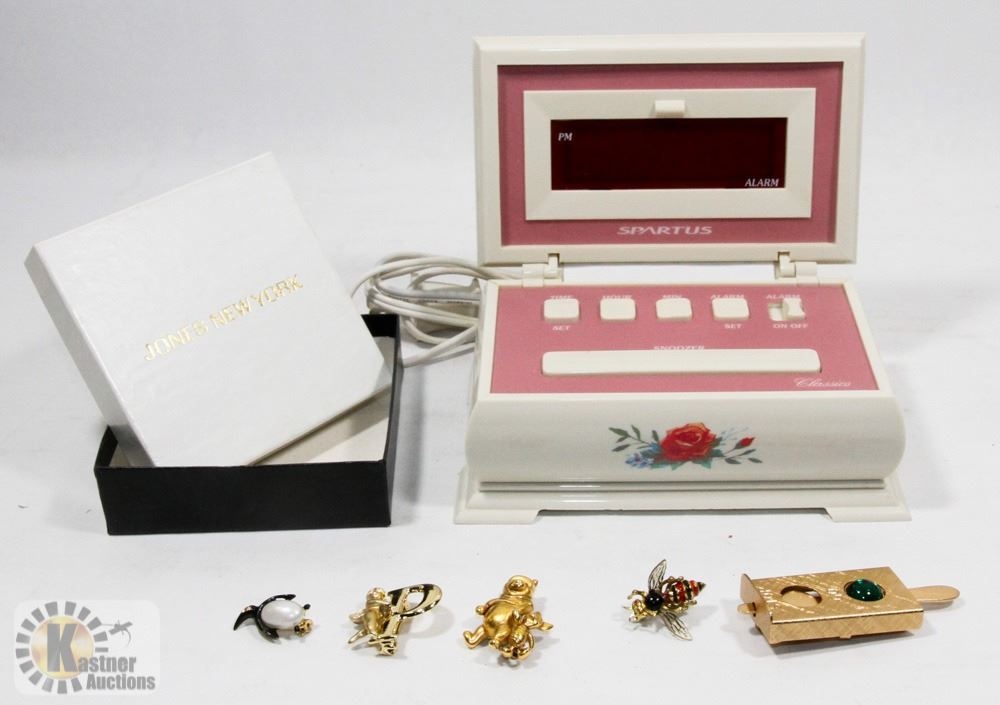 JEWELRY BOX/CHEST DIGITAL BATTERY/ELECTRIC ALARM CLOCK "TESTED W/5 VINTAGE BROOCHES ALL STAMPED. COLLECTIBLES