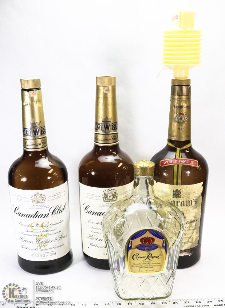 EMPTY; 1969 SEAGRAMS V.O. WITH PUMP, 1971 & 1973 CANADIAN CLUB, CROWN ROYAL. COLLECTIBLES.