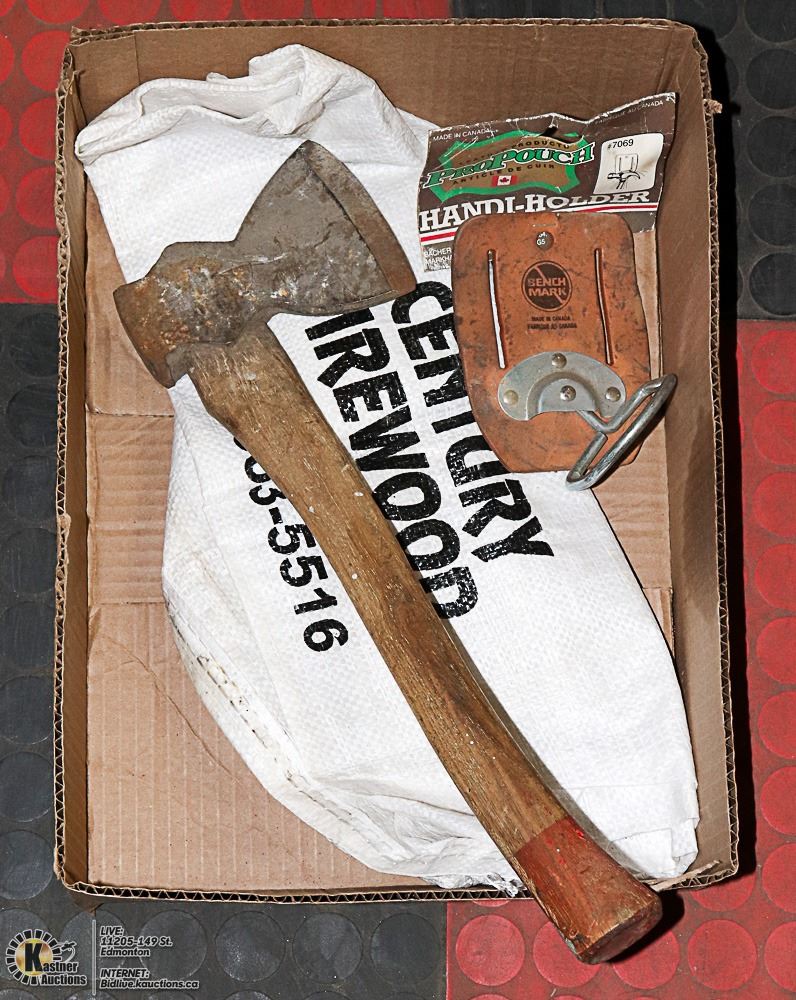 HANDLE WITH VINTAGE "NEW" PRO-POUCH LEATHER BELT HANDI-HOLDER AND SYNTHETIC FIRE WOOD SACK - TOOLS