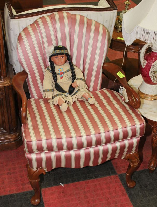 VINTAGE WOOD ARMCHAIR W STRIPE UPHOLSTRY