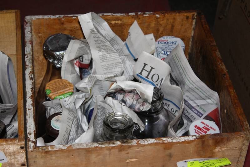 VINTAGE WOODEN BOX W/ ASST LABLED MILK BOTTLES
