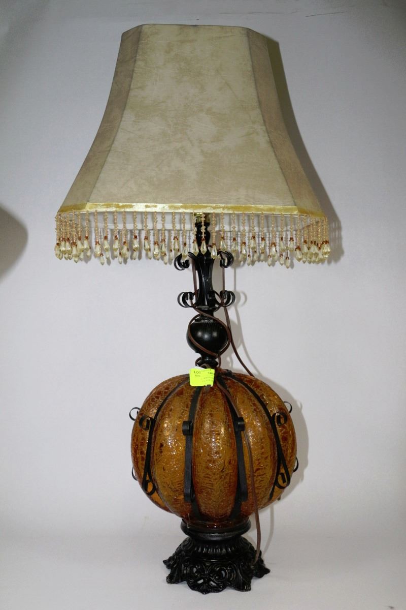 VINTAGE WROUGHT IRON AMBER CRACLE GLASS LAMP