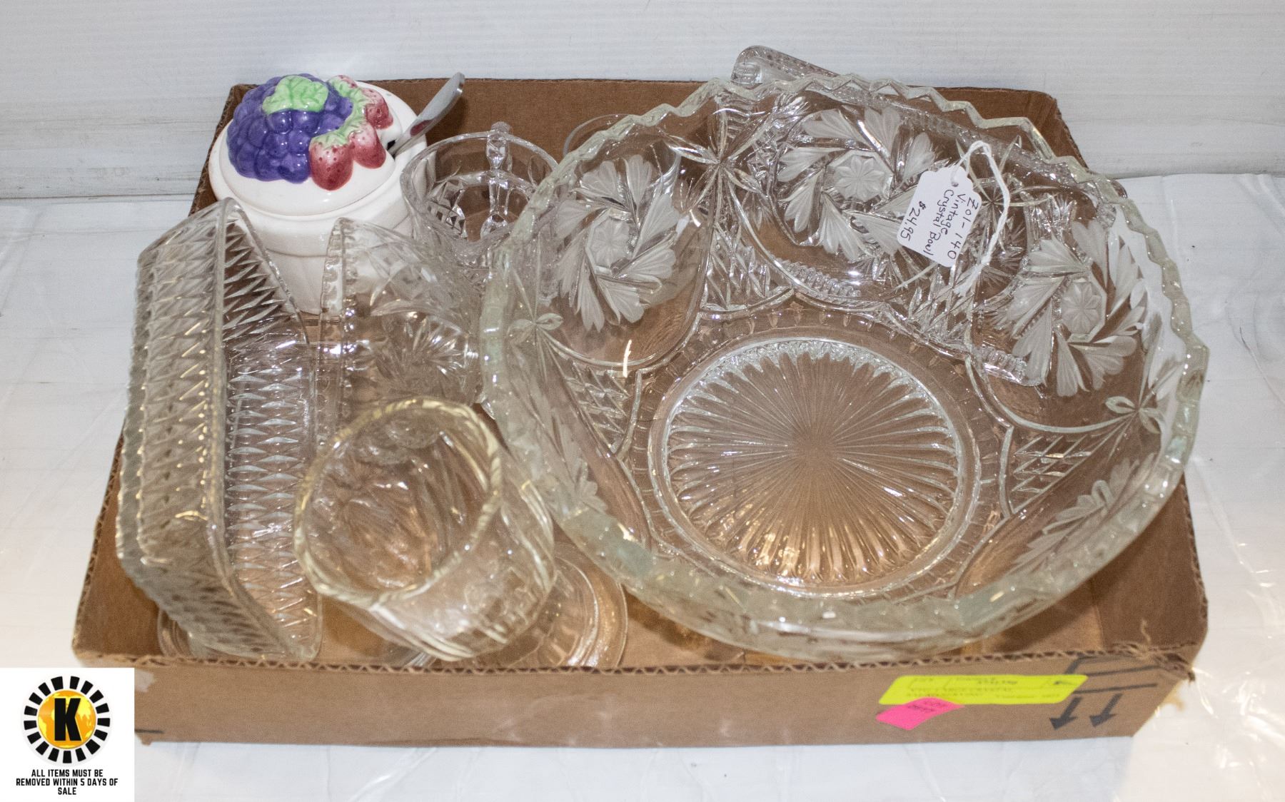 BOWL, VTG. JAM JAR W SPOON AND MORE