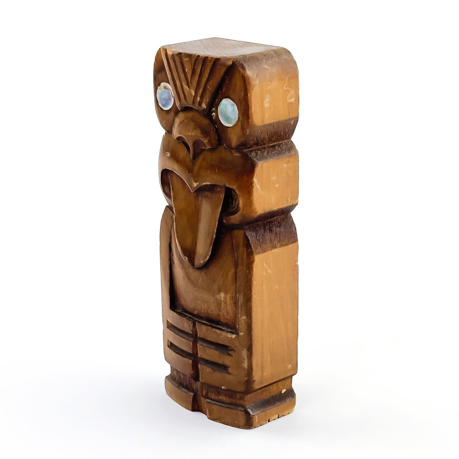 #8527 - VINTAGE MINIATURE MAORI TIKI WOOD CARVING - CARVED IN ROTORUA NEW ZEALAND. HOME DECOR WOOD CARVING SCULPTURE FIGURINE. MEASURES: 3.5” (9 CM) TALL BY 1.25” (3.25 CM) WIDE AND .75” (2 CM) DEEP