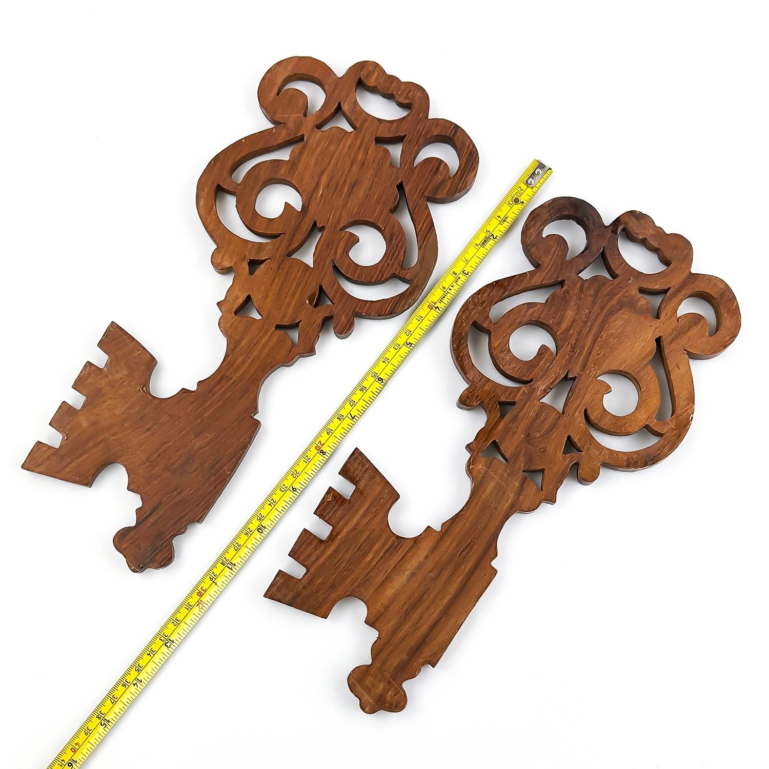 #8067 - LARGE HAND CRAFTED WOODEN SKELETON KEYS. UNMARKED WOOD HOME OR OFFICE WALL DECOR SCULPTURES. THEY MEASURE: 12” (30.5 CM) LONG BY 5.5” (14 CM) WIDE AND .375” (1 CM) THICK