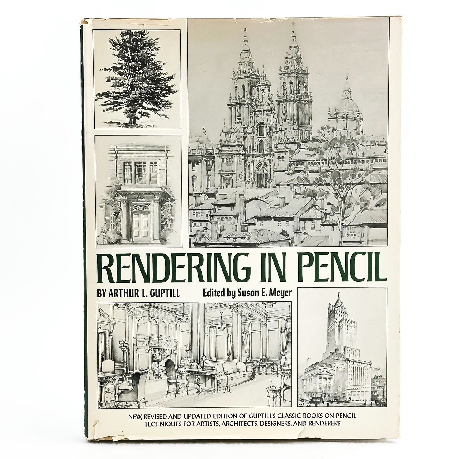 #8188 - VINTAGE RENDERING IN PENCIL BY ARTHUR L. GUPTILL. PENCIL TECHNIQUES FOR ARTISTS, ARCHITECTS, DESIGNERS AND RENDERERS. COPYRIGHT 1977 BY WATSON-GUPTILL PUBLICATIONS. LARGE HARDCOVER BOOK WITH DUST JACKET - 272 PAGES. MEASURES: 12.25” X 9.25”