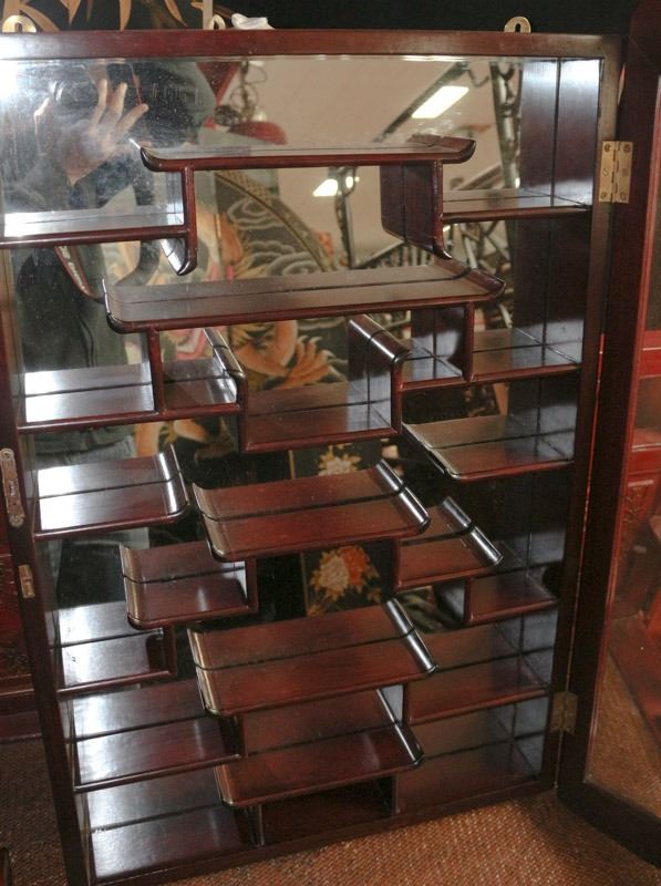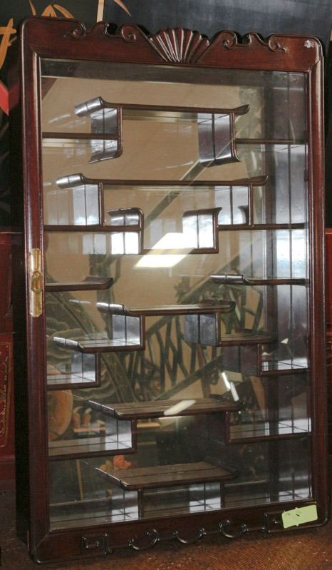 Completely hand carved of solid rosewood. This unique wall curio cabinet displays up to 20 collectibles with approximately 4-inch space between shelves - 33" X 19.5" X 3.5"