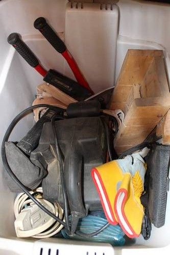 WHITE BIN W/ JIG SAW, BOLT CUTTERS, BELT SANDER,