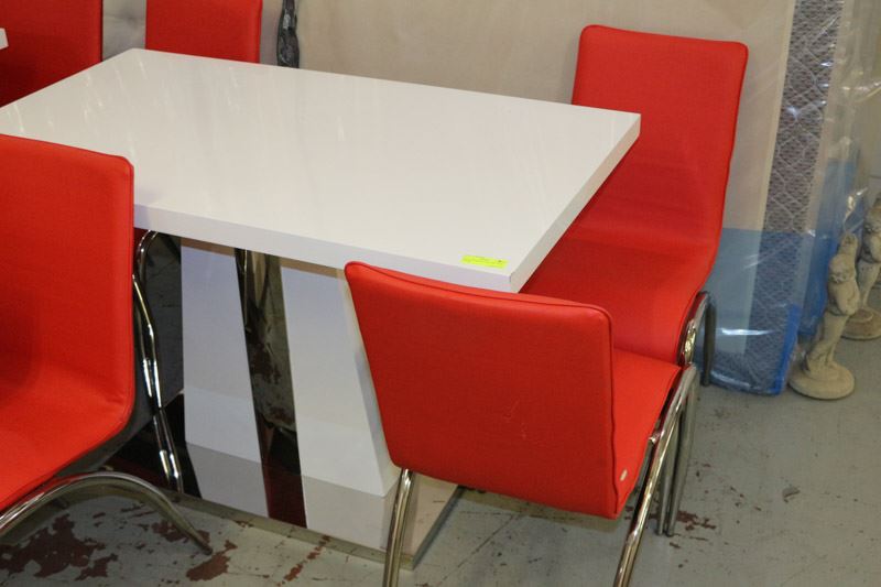 WHITE & CHROME TABLE W/ 4 RED CHAIRS