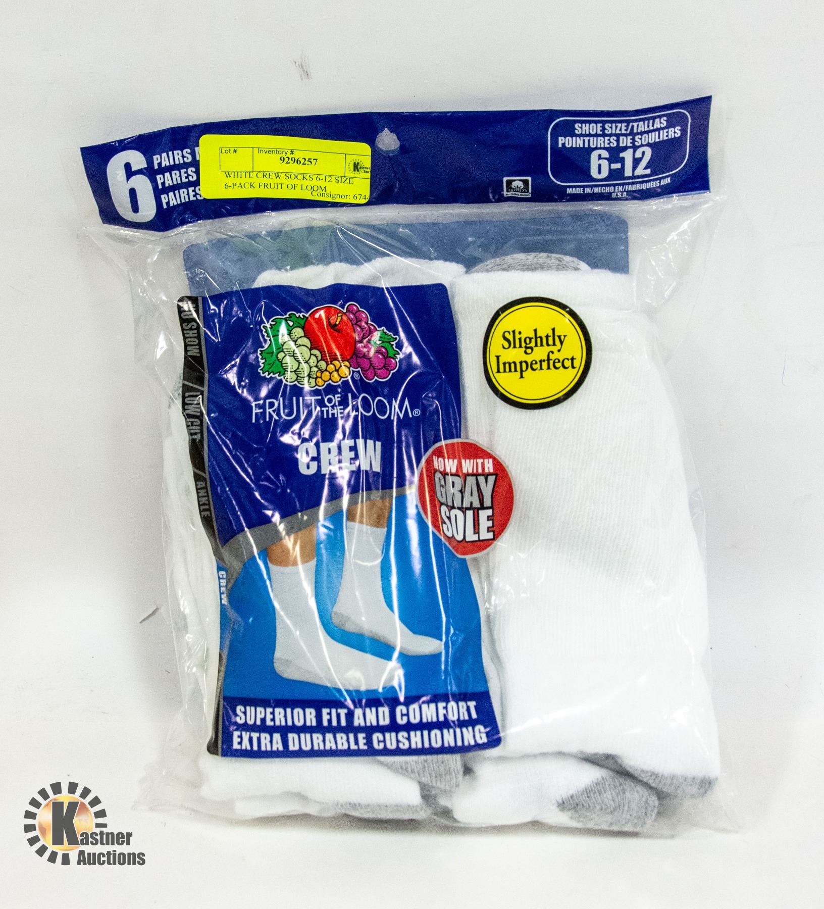 WHITE CREW SOCKS 6-12 SIZE 6-PACK FRUIT OF LOOM