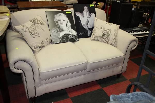 WHITE FABRIC NAILHEAD LOVE SEAT