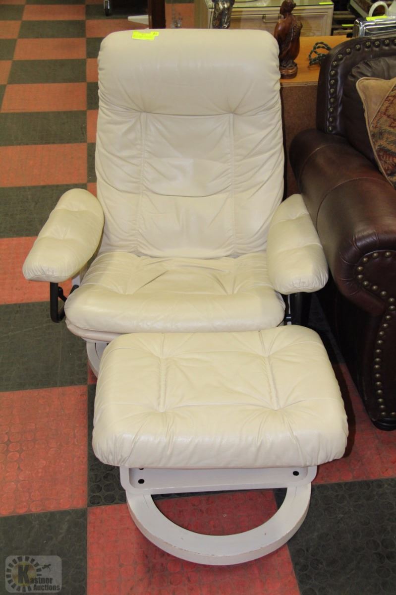 WHITE LEATHER LOUNGE CHAIR WITH OTTOMAN