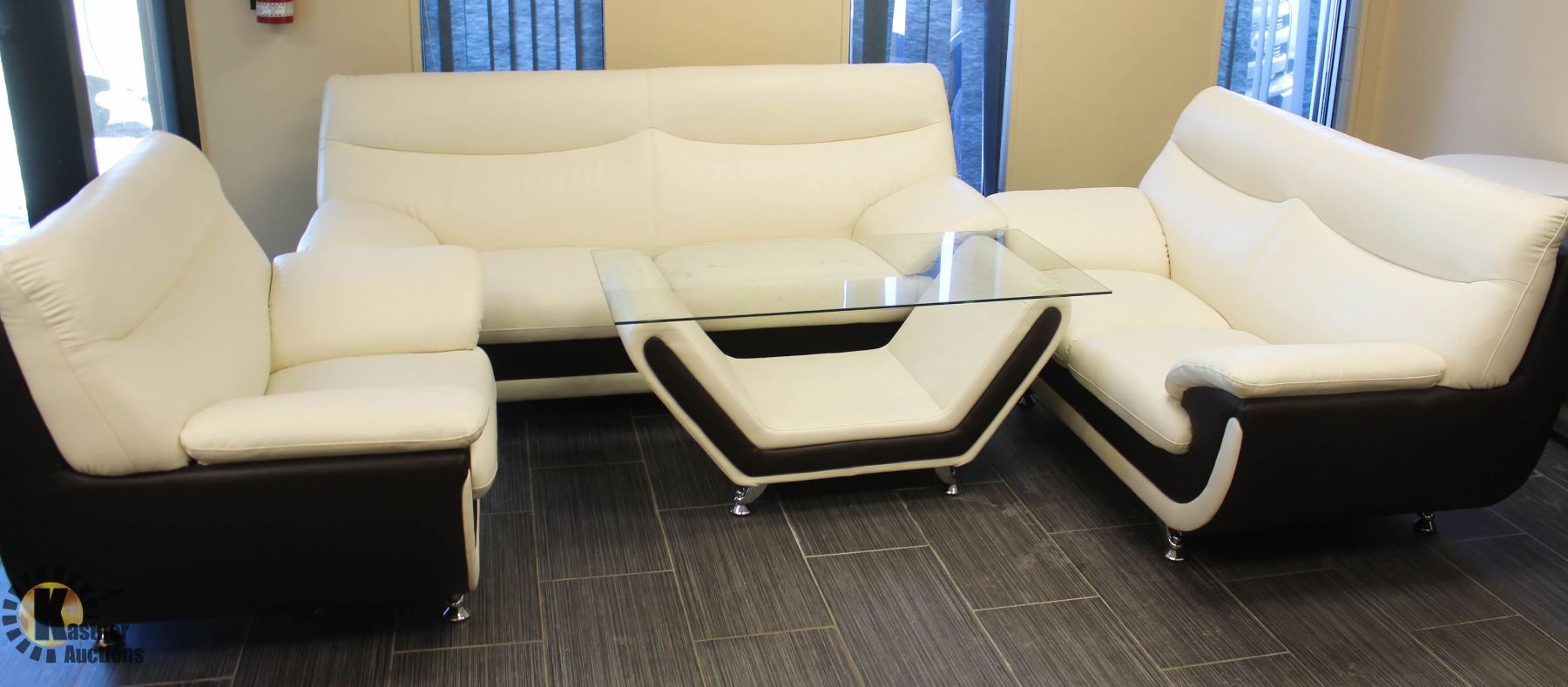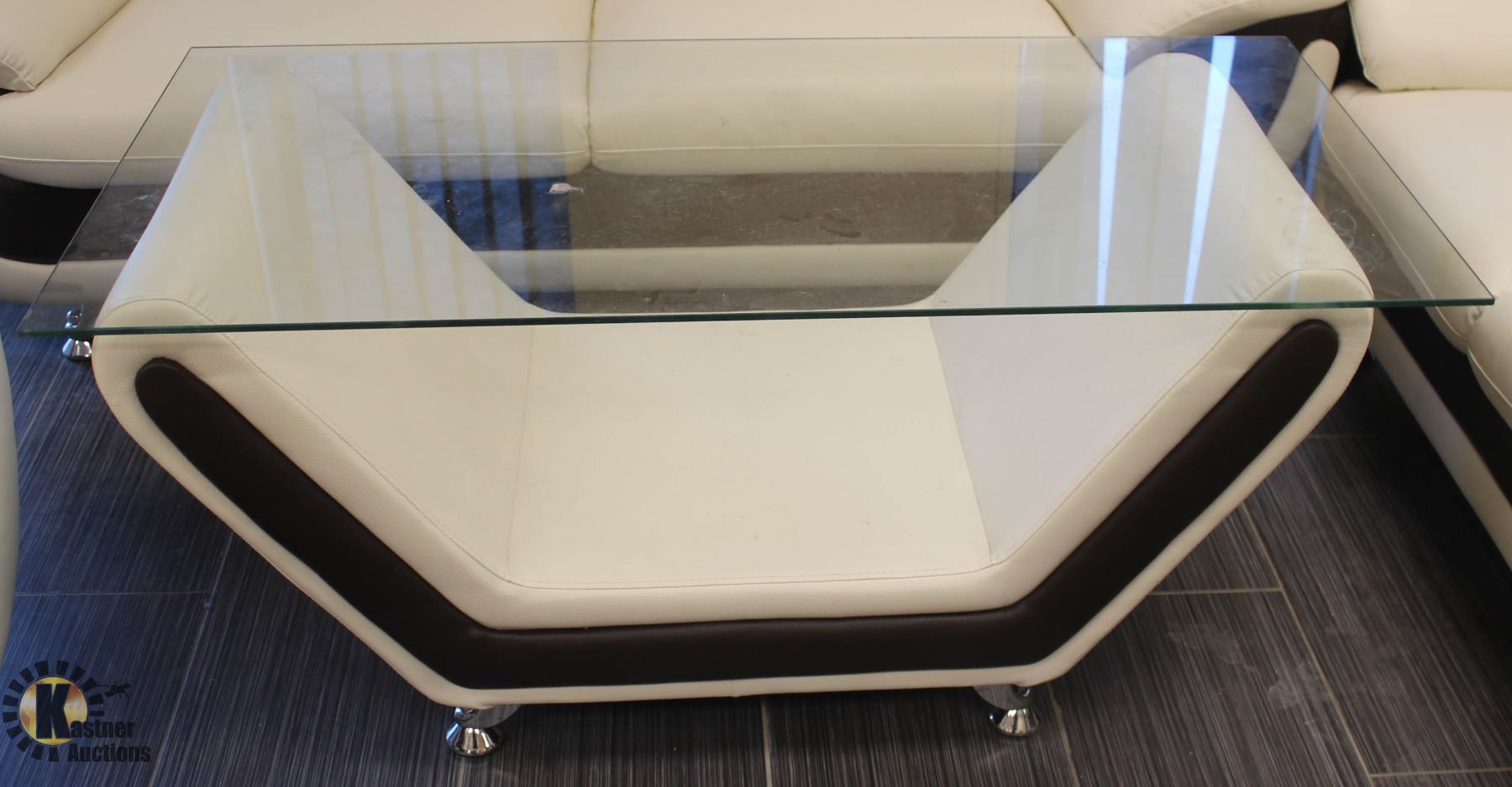 COUCH, LOVESEAT, CHAIR & GLASS TOP COFFEE TABLE. SOFA 77" X 34", LOVESEAT 61" X 34", CHAIR 45" X 34", TABLE 47" X 24".