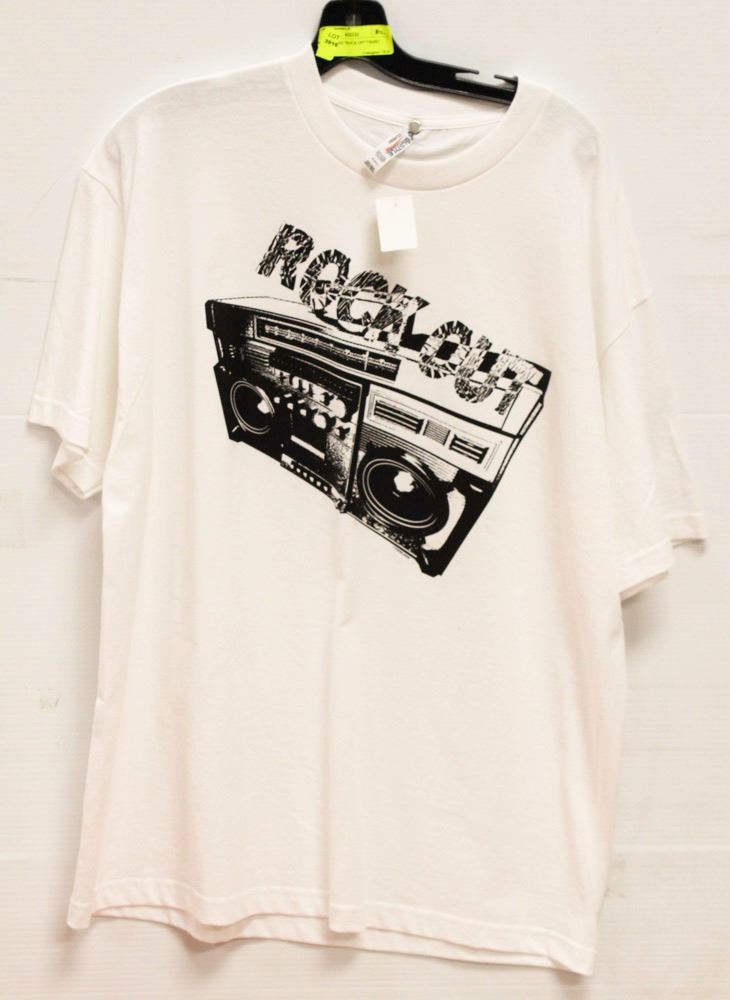 WHITE MENS "ROCK ON" TSHIRT - SIZE LARGE