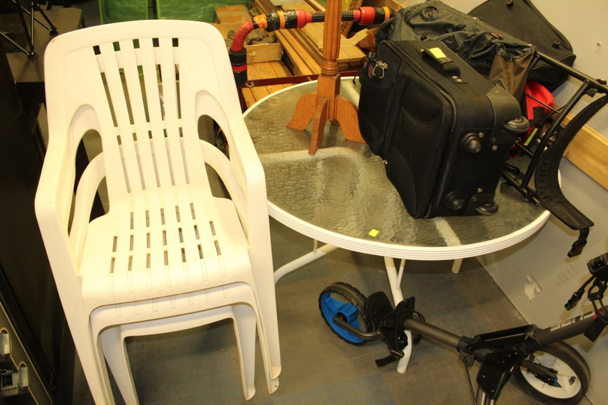 WHITE METAL & GLASS PATIO TABLE & 4 CHAIRS