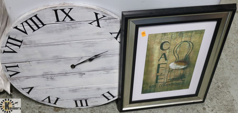 WHITE WASHED WALL CLOCK & CAFE FRAMED PICTURE.