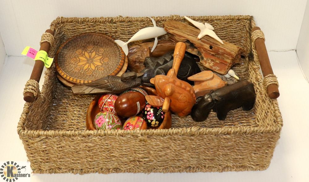 WICKER BASKET WITH ASSORTED WOOD ORNAMENTS