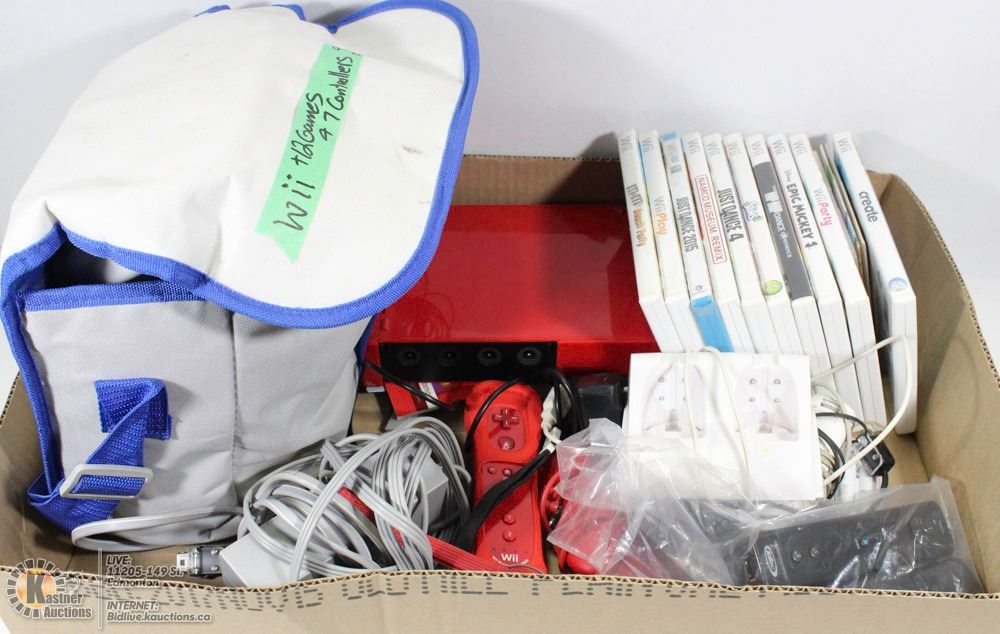 WII W/12 GAMES, 7 CONTROLLERS & BAG OF ACCESSORIES
