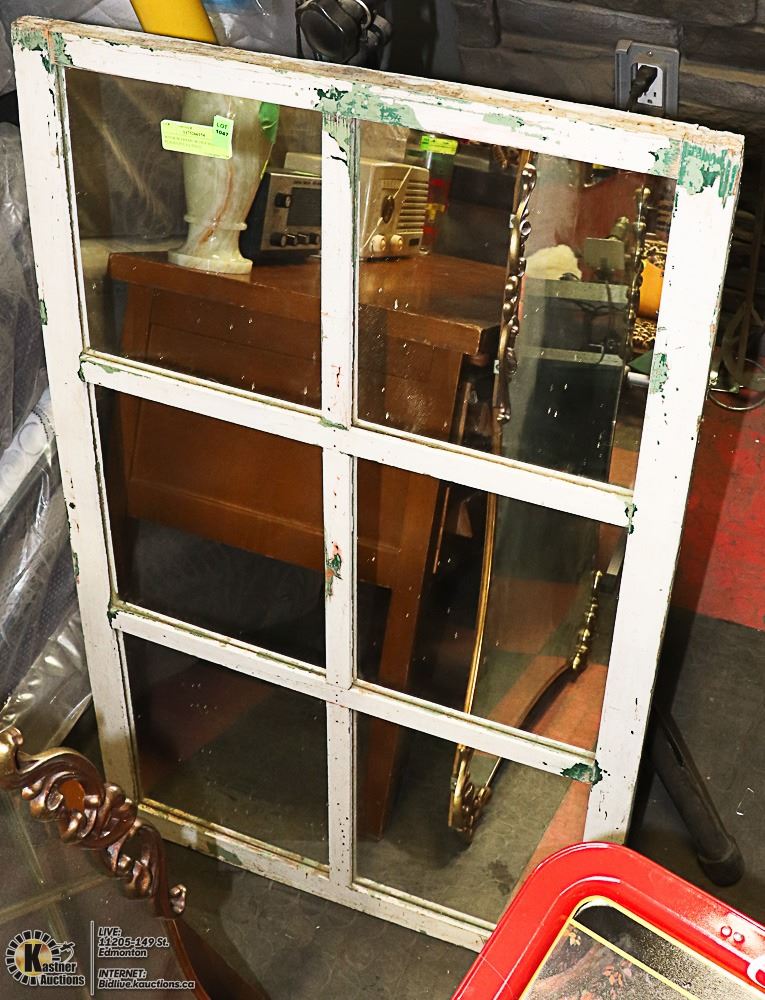 WOOD WINDOW FRAME ON HINGES 24 5/8'' X 7/8'' X 3 1/4'' H THE TWO EXTRA PIECES HAVE DAMAGE TO THEM