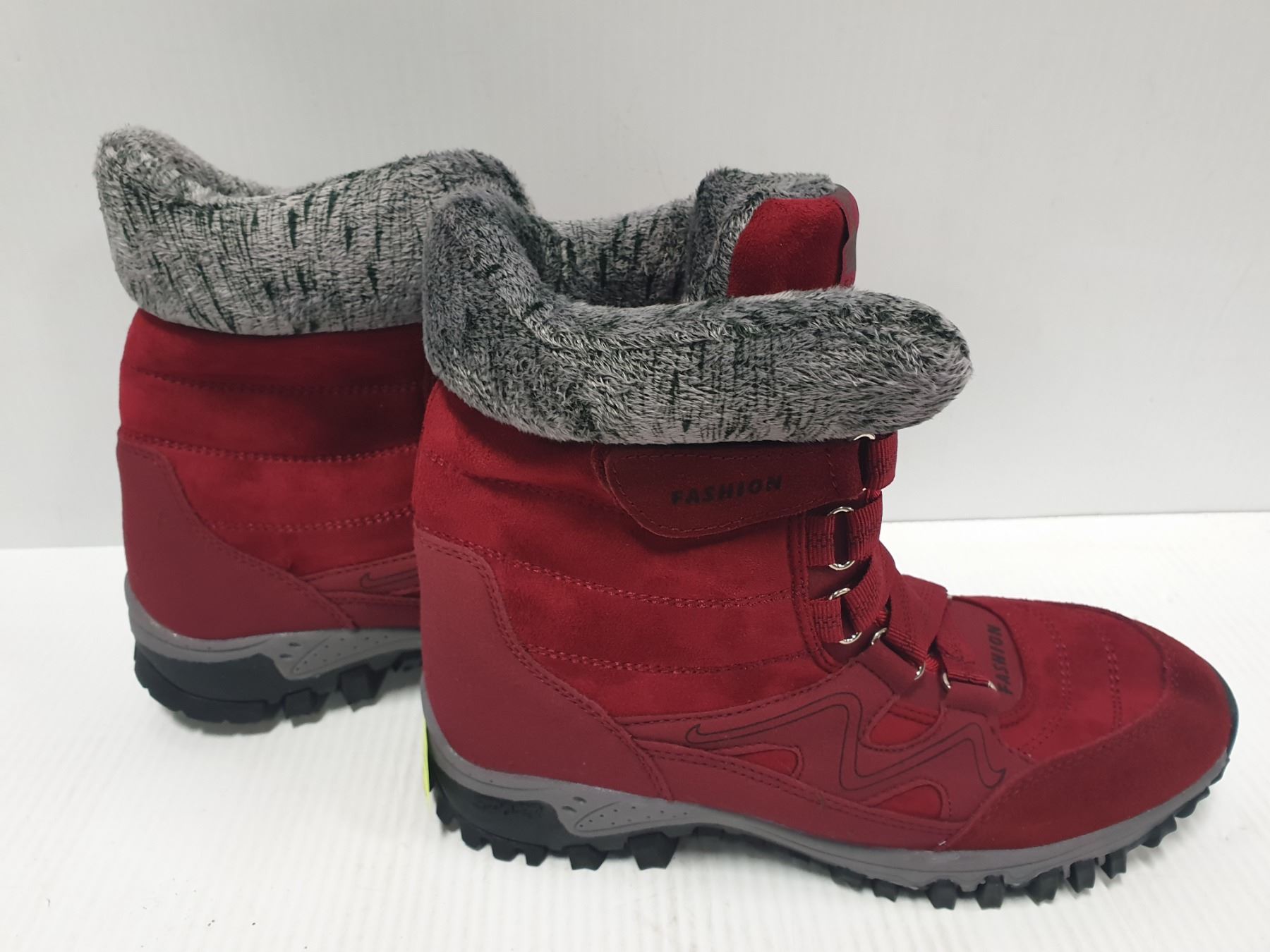 WOMENS RED FASHION BOOTS, SIZE 8.