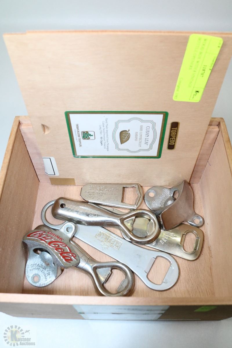 WOOD BOX WITH 8 VINTAGE BOTTLE OPENERS