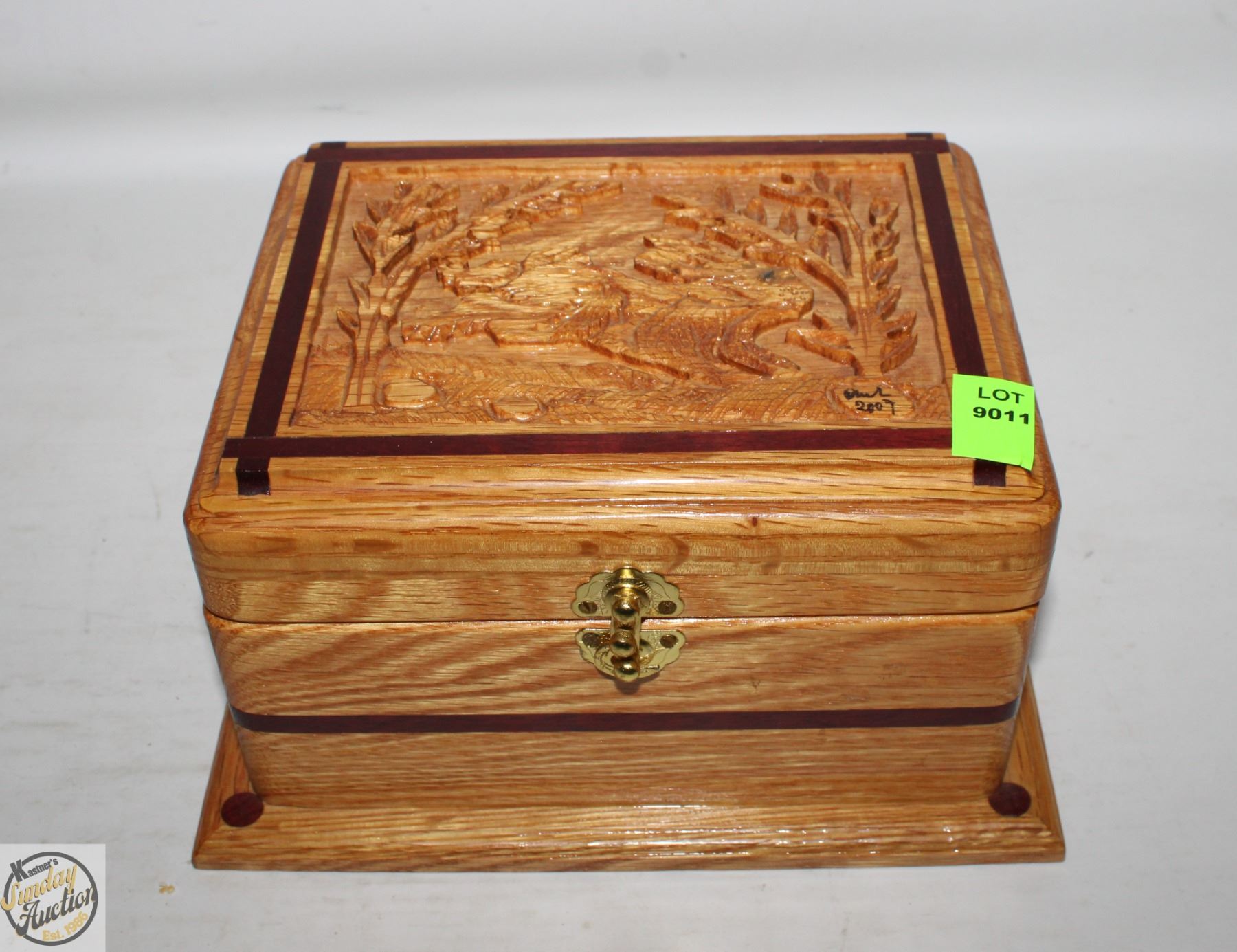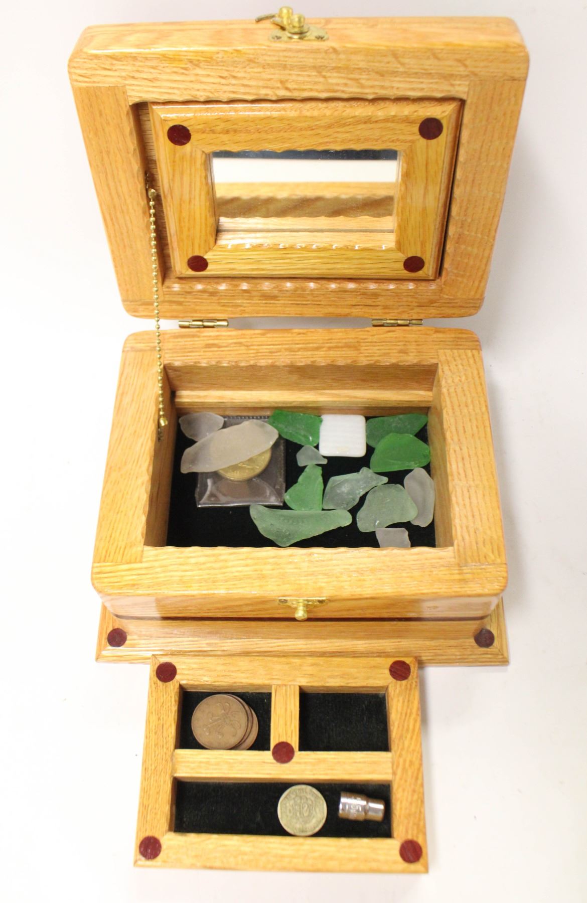WOOD CARVED JEWELRY BOX W/ COINS & SEA GLASS