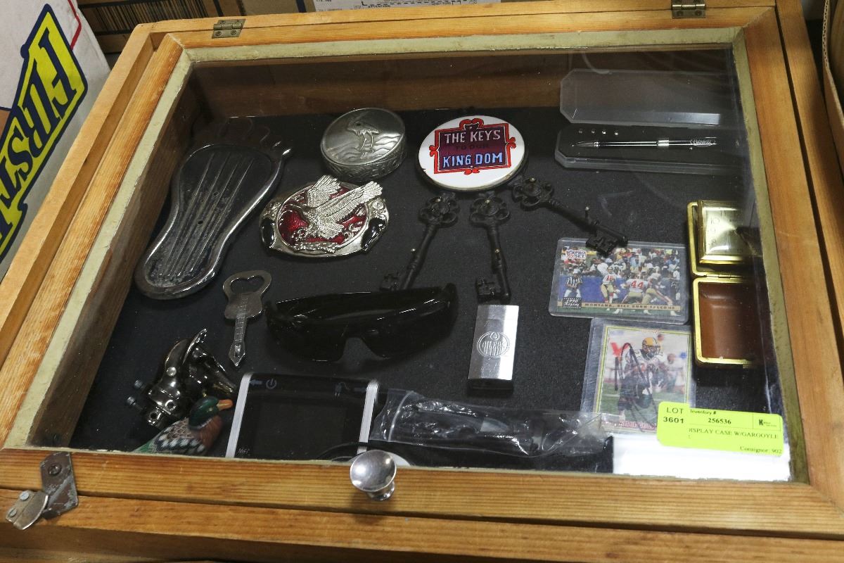 HANDLE HEAD, EAGLE BELT BUCKLE, VINTAGE CLOCK, BIG FOOT GAS PEDDAL, STORK-METAL BOX & MUCH MORE