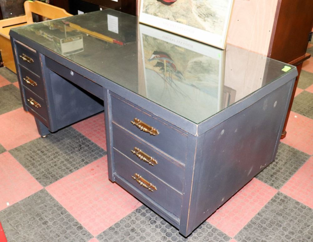 WOOD GREEN DESK WITH GLASSTOP, 59.5"X31.5"X29.5".