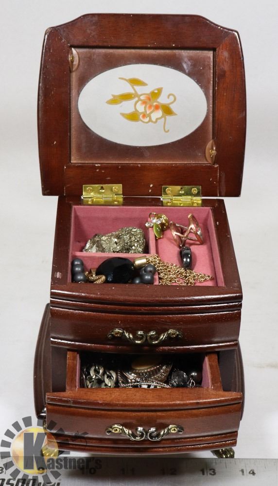 WOOD JEWELRY BOX WITH ASSORTED JEWELRY