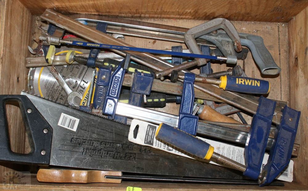 WOOD TOOL BOX W/ SAWS AND CLAMPS