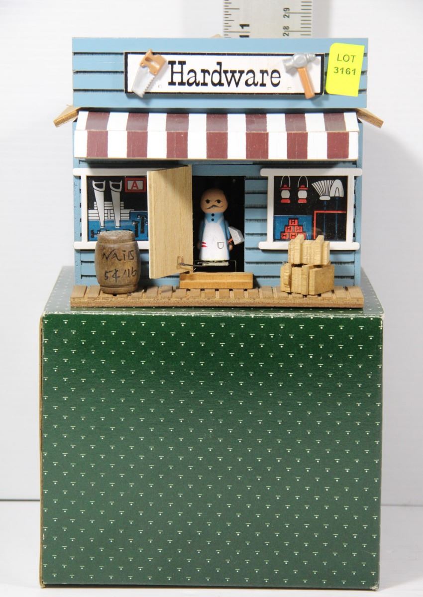 WOODEN ANIMATED HARDWARE STORE MUSIC BOX