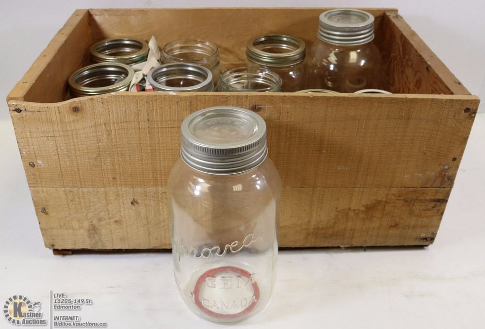 WOODEN BOX FULL OF JARS
