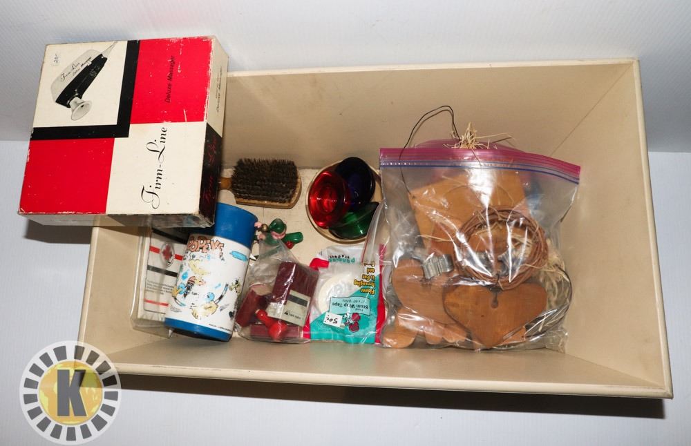 INCLUDING VINTAGE DECOR, TOY FIGURE, STAMPS, WHITEBOARD ERASER, AND MORE***ITEM(S) LOCATED IN LETHBRIDGE ALBERTA