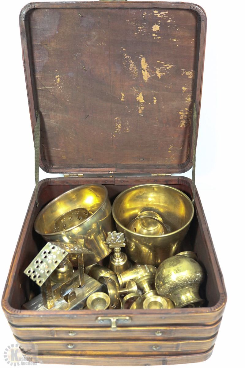WOODEN BOX WITH BRASS DECOR INCL BELLS AND MORE