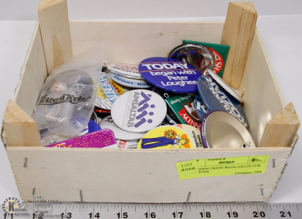 WOODEN CRATE WITH COLLECTOR BUTTONS
