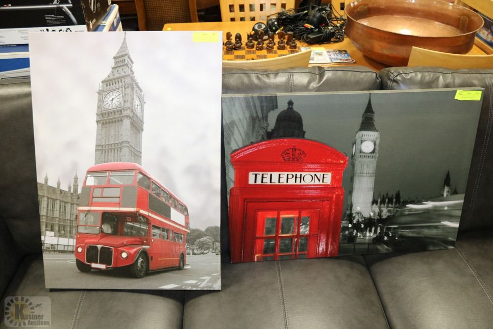PICTURES OF A BUS AND RETRO TELEPHONE STAND NEW YORK 27"X20" EACH ATTENTION THIS LOT IS SOLD 2 TIMES THE MONEY