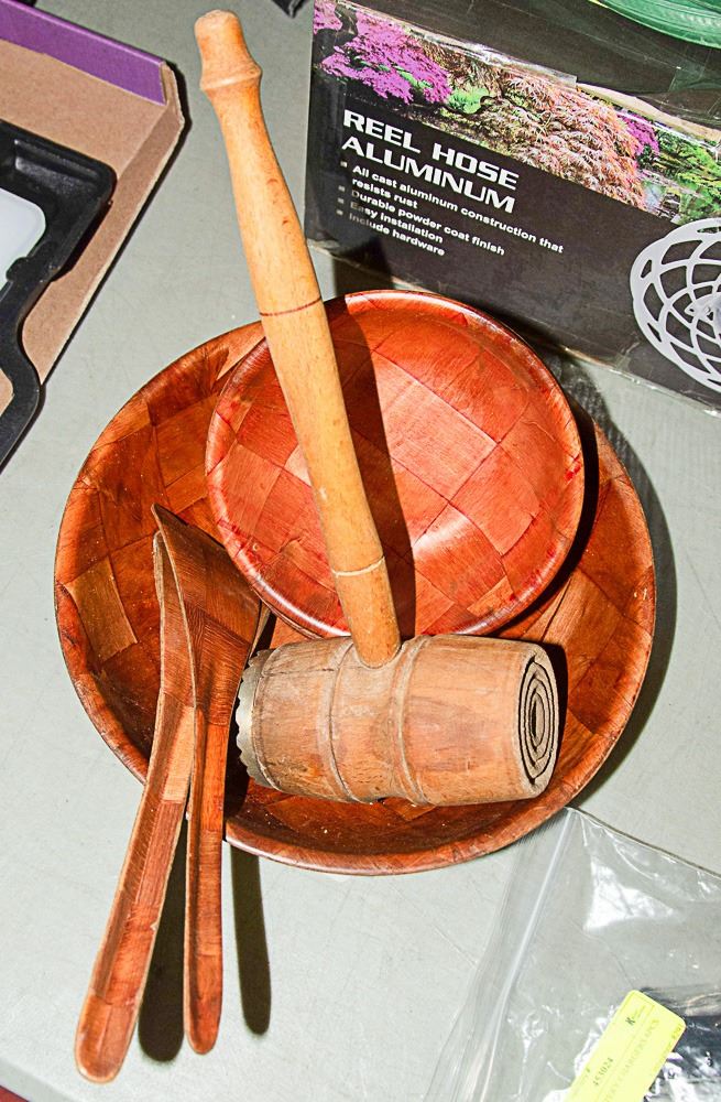 WOODEN KITCHEN ITEMS 6 SMALL BOWLS, 1 LARGE BOWL