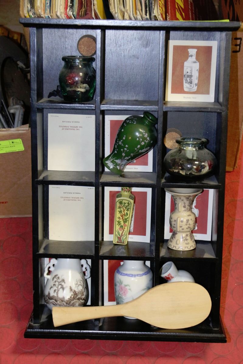 WOODEN SHELF WITH 8 COLLECTOR VASES