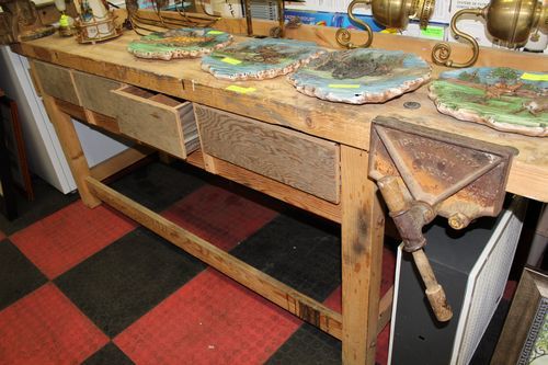 WOODEN WORK BENCH W/ WOOD VICE & METAL VICE