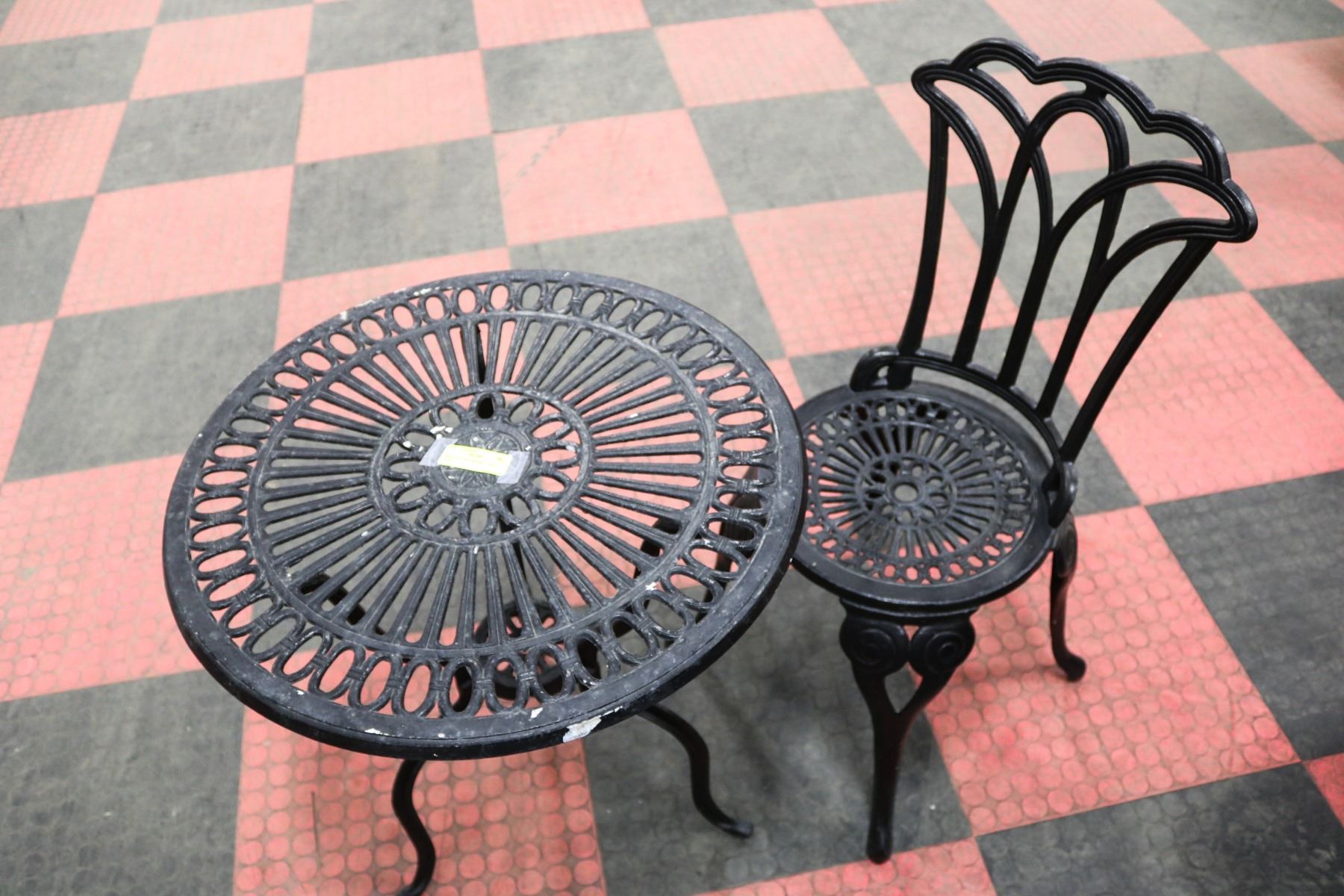 WROUGHT IRON BISTRO TABLE , 1 CHAIR