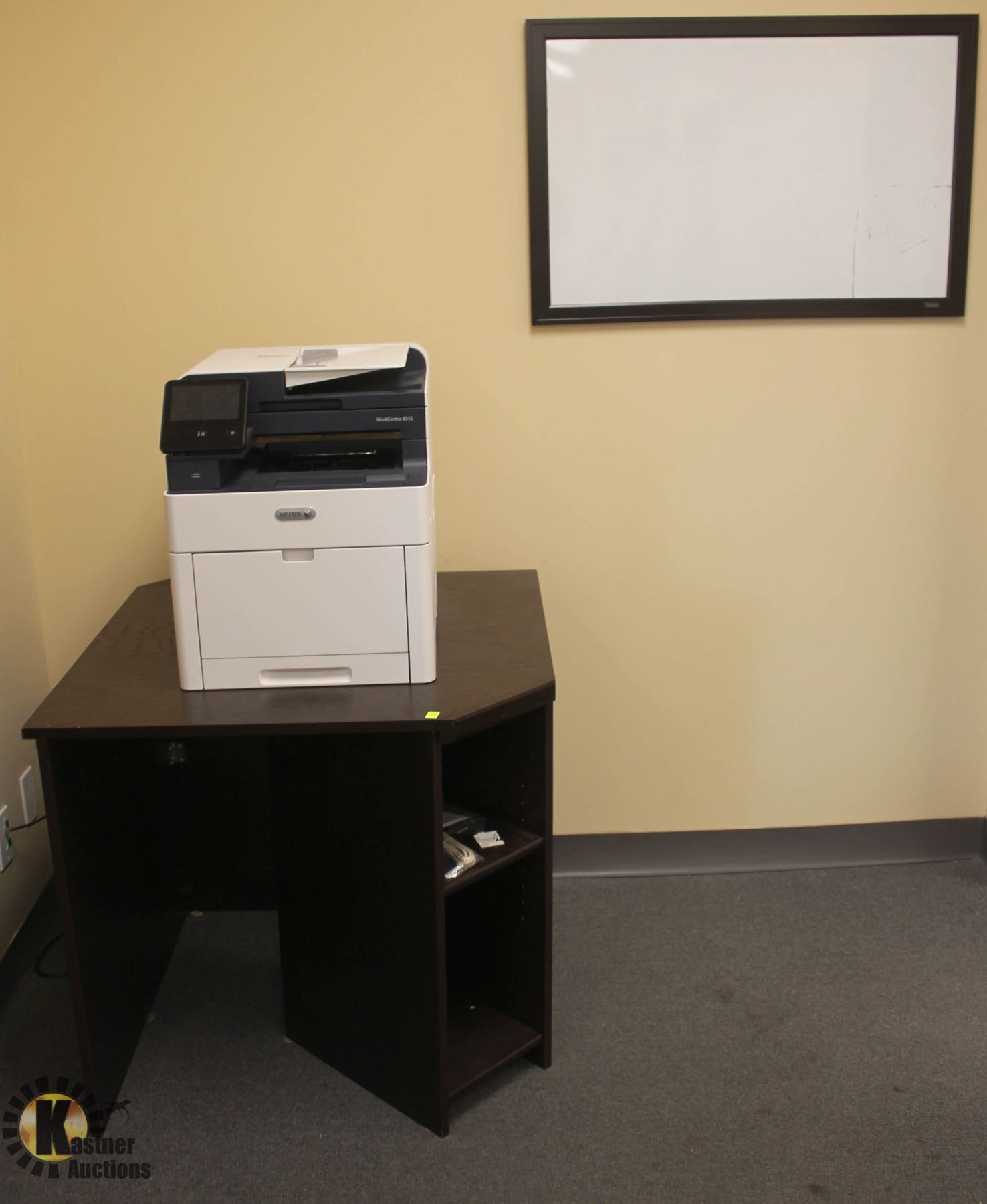 W/ BROWN SHELVING UNIT & WALL MOUNT WHITE BOARD.