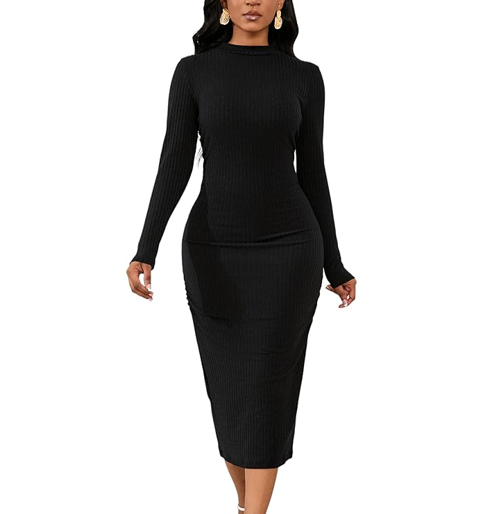 YAJEDO WOMENS 2024 BASIC RIBBED KNIT BODYCON LONG SLEEVE SLIM FIT CLUB SHEATH MIDI DRESS ELEGANT