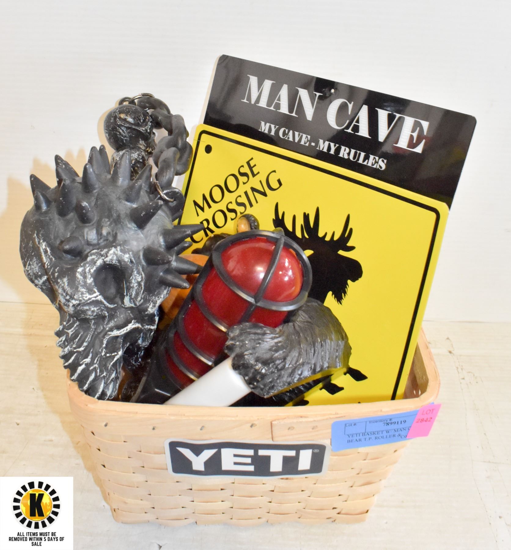 YETI BASKET W/ MAN CAVE SIGNS, BEAR T.P. ROLLER &