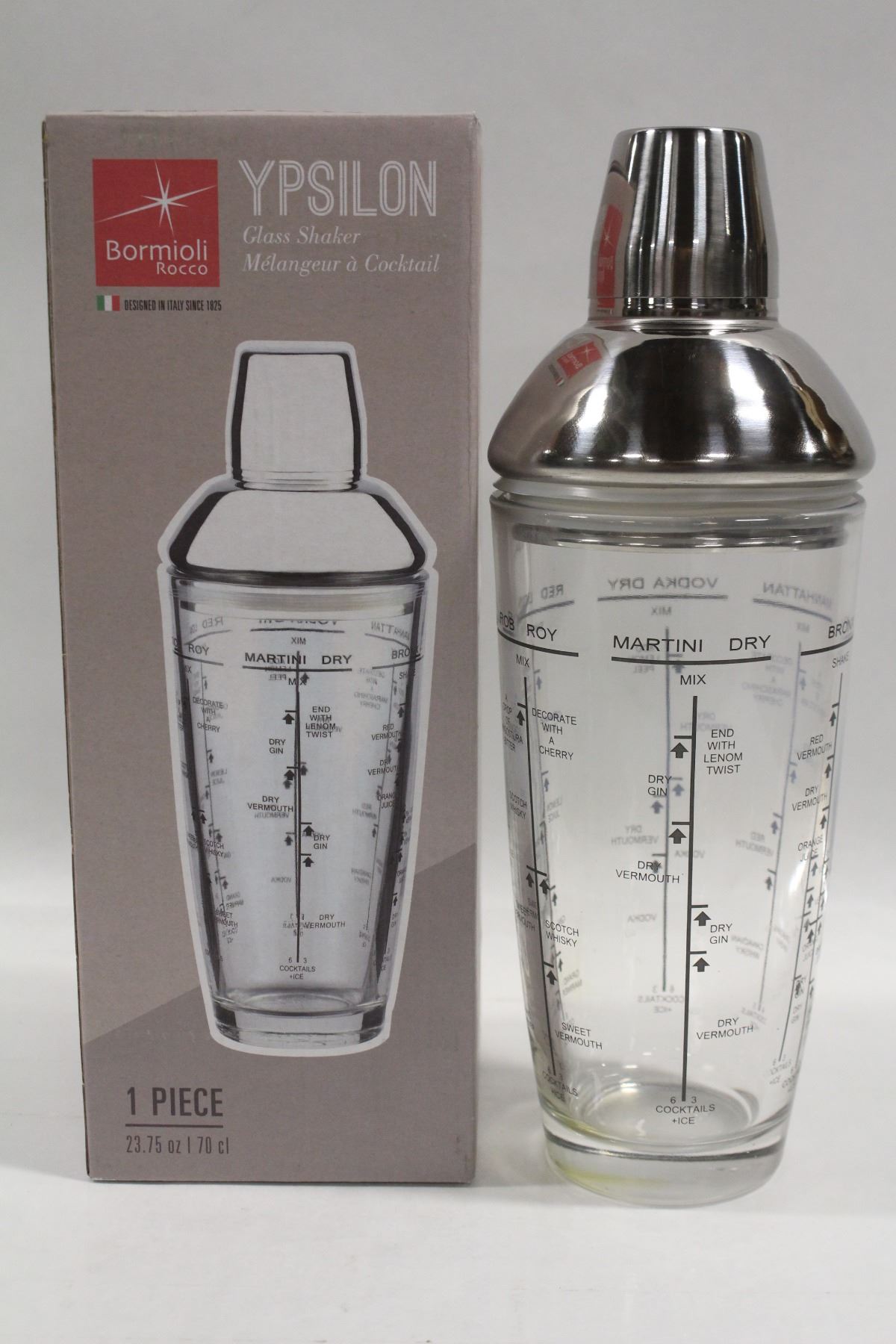 NEW IN BOX, 23.75 OZ, STAINLESS STEEL CAP W/ SILICON SEAL, THICK GLASS. MEASURE LINES FOR DRINK TYPES: MARTINI DRY, VODKA DRY, MANHATTAN, RED LION, ROB ROY, & BRONX.