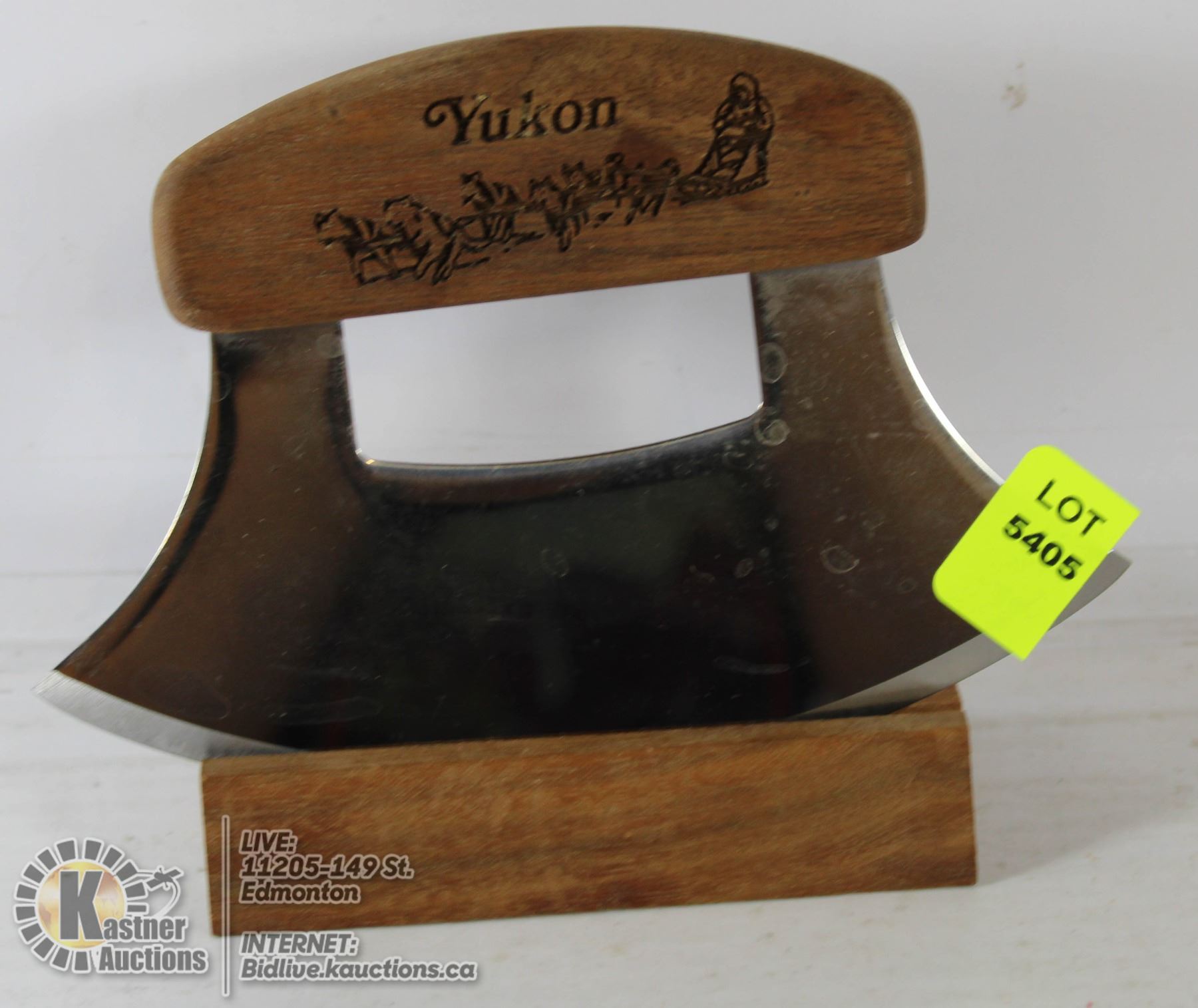 YUKON ULU KNIFE WITH DOG SLED CARVING AND STAND
