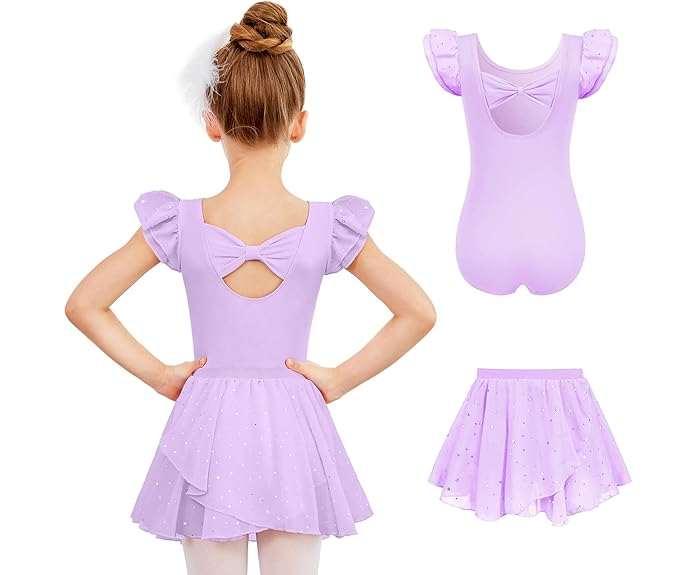 Zaclotre Girls Ballet Leotards Toddler Ruffle Sleeve Bow Back Dance Outfits Leotard with Removable Shinny Skirt Combo