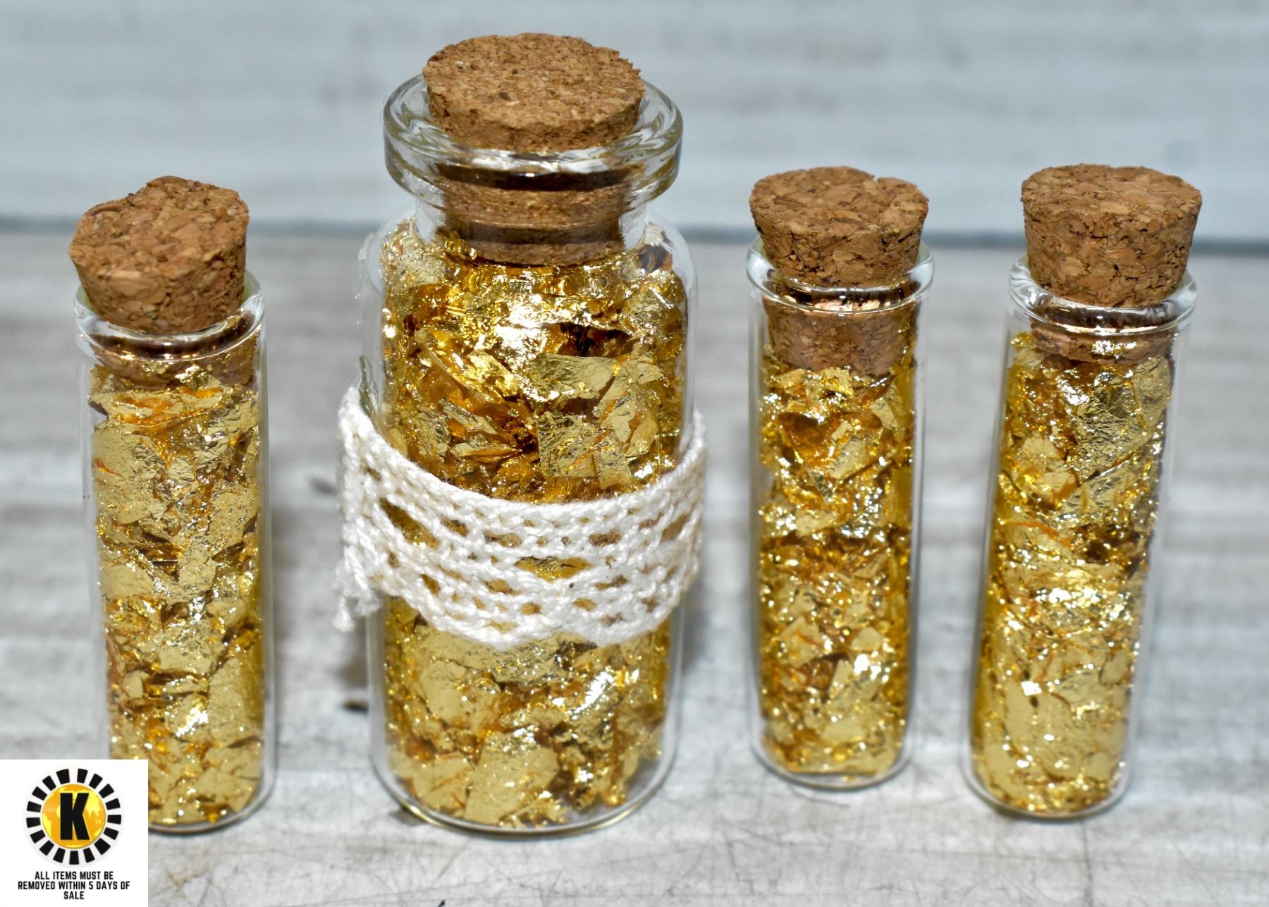 x4 GLASS BOTTLES FILLED WITH GOLD FOIL FLAKES